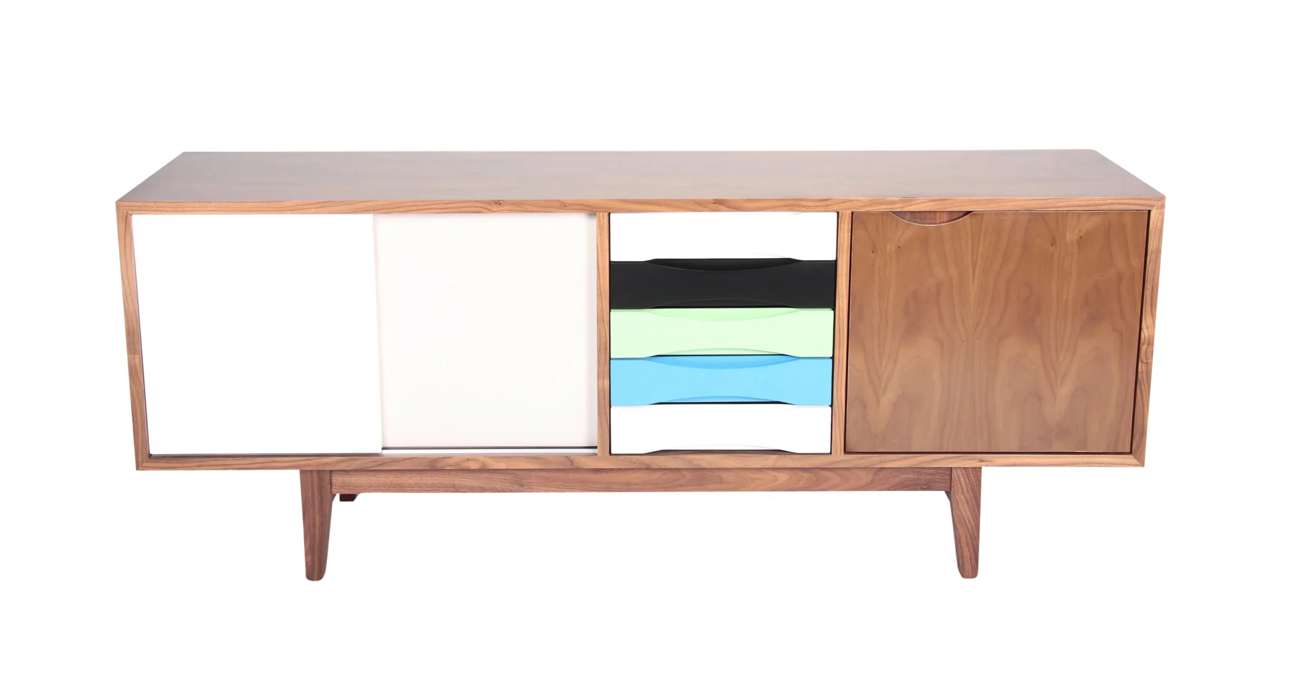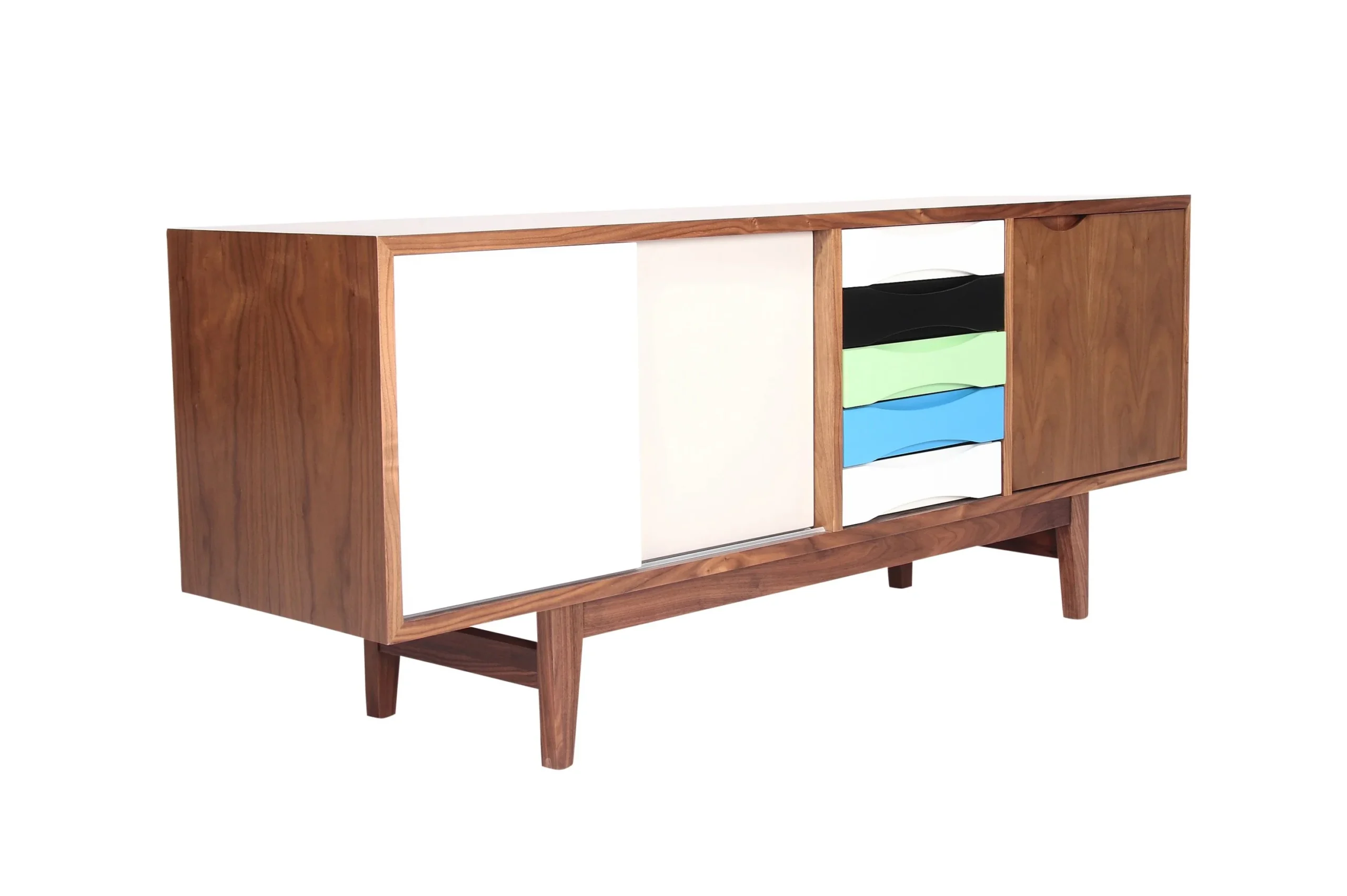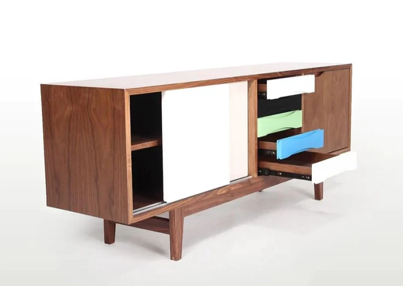 Crafted with a walnut veneer, angled legs, and stylish accents, this sideboard embodies the timeless charm of mid-century design. Its clean lines and lacquered gradient drawer fronts add a touch of sophistication to any space.