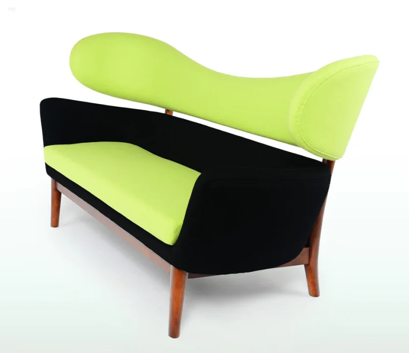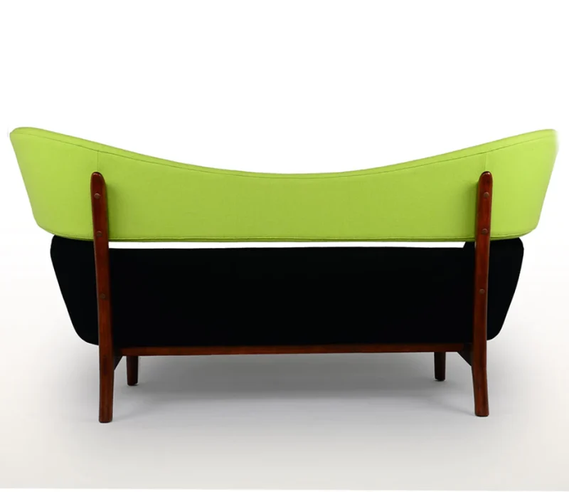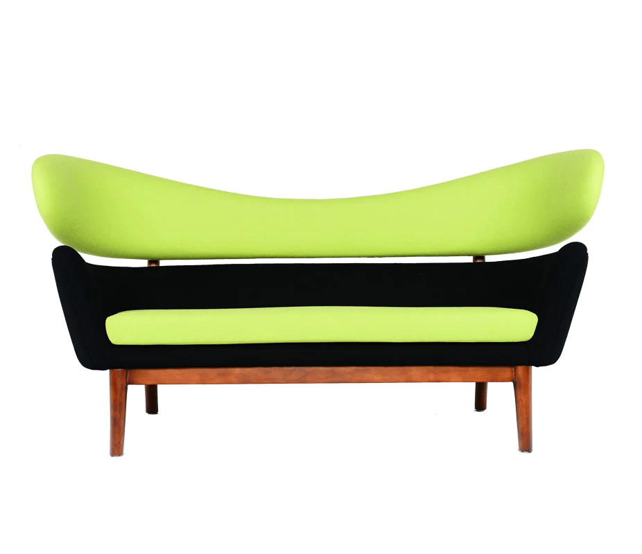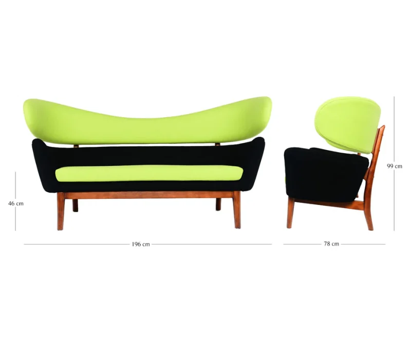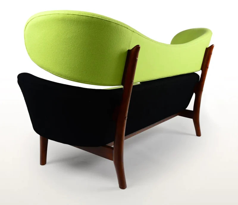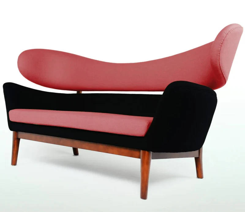 The sofa has an upholstered body divided in two, resting upon an elegant and light construction of wood – a typical example of how Finn Juhl separated the elements in order to create a visual lightness.