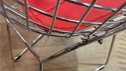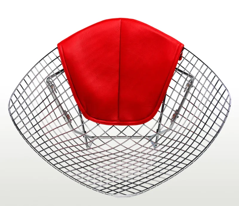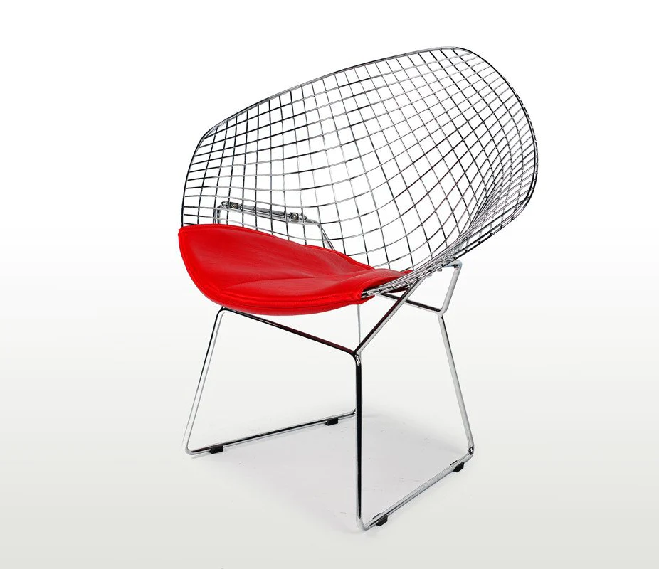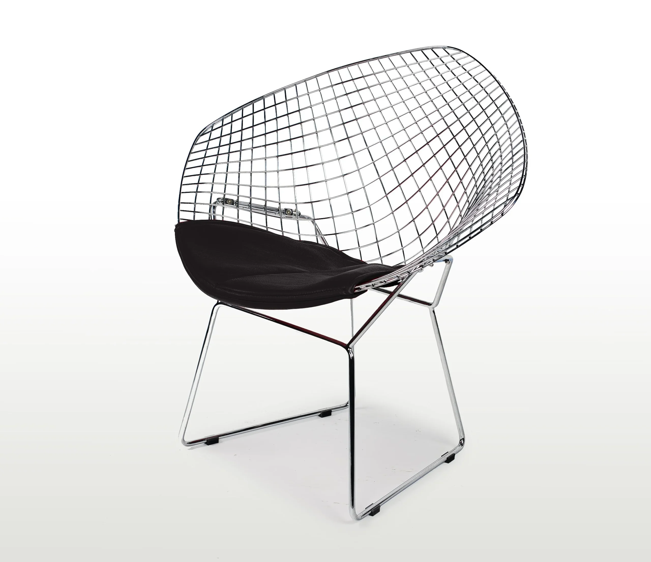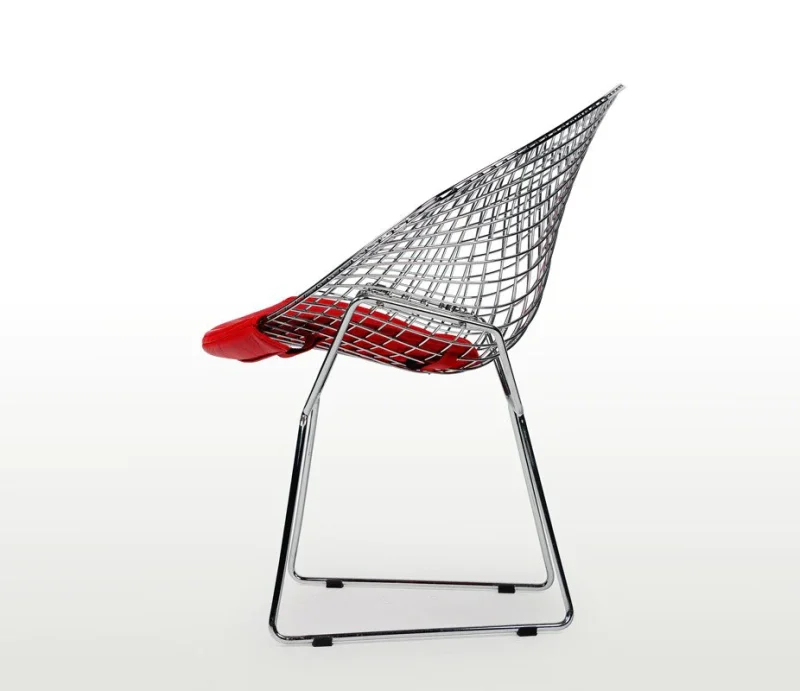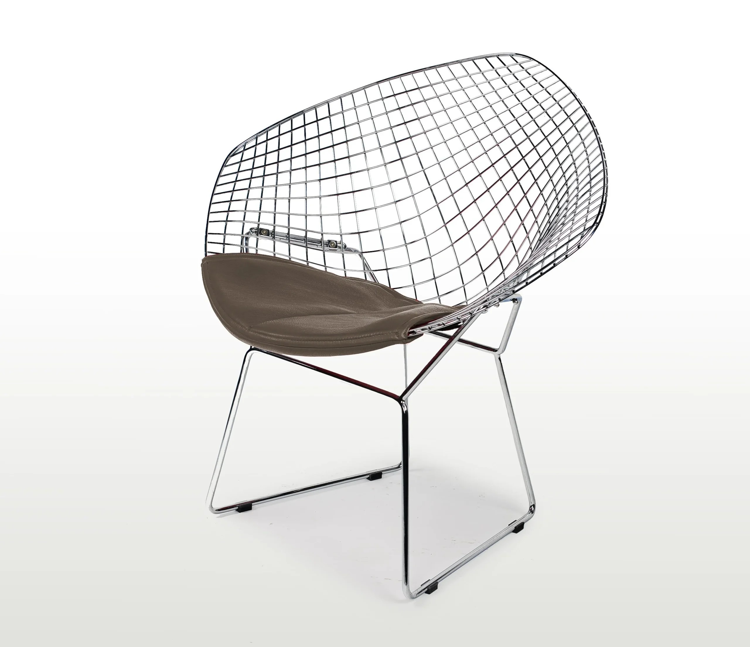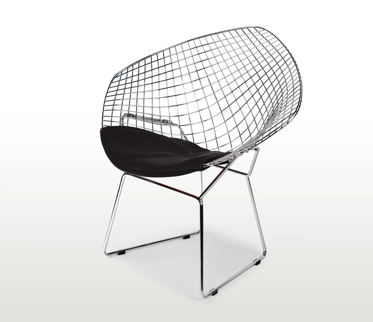 Bertoia experimented with metal until arising at the wire grid concept could be shaped at will. He not only created the airy design of the chair but also devised the production molds used for mass manufacture.